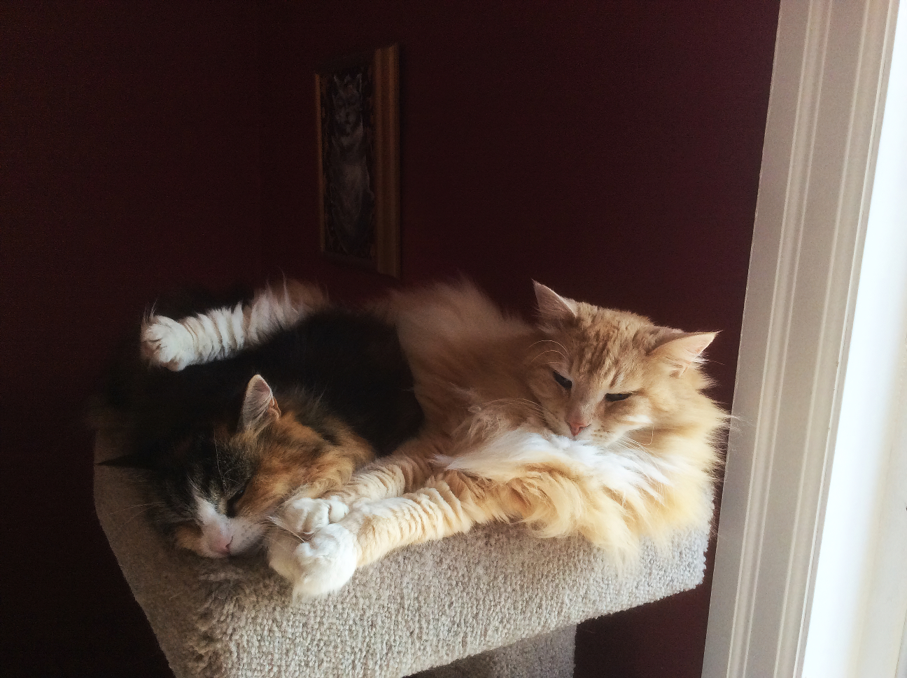 Pumpkin's half sister, a torbie named Salem, came to our household a few months later. With Basil and Salem it appeared to be a situation of unrequited love. If Basil and Salem were both on the floor in a room, Basil would try to get close to Salem. Before Basil could cuddle with Salem, Salem would jump onto a couch perpetually frustrating Basil.